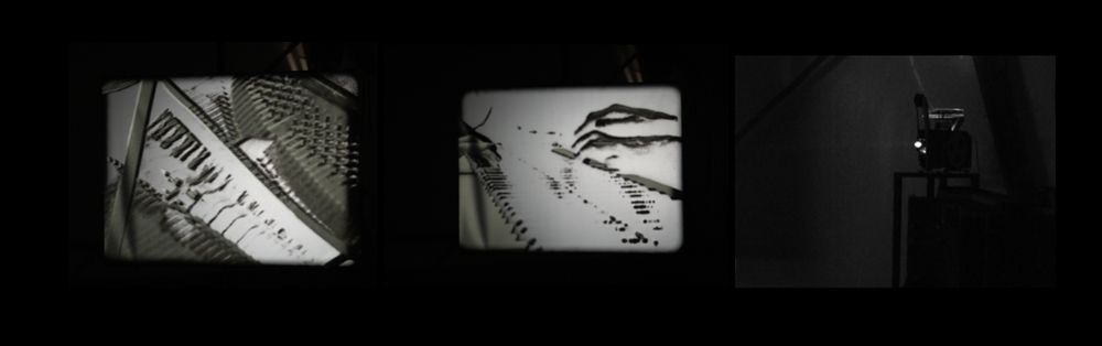 Installation for two 16 mm loops that reveal a constantly changing sound, Cataclysme piano 4 in Galpon, Geneva 2025